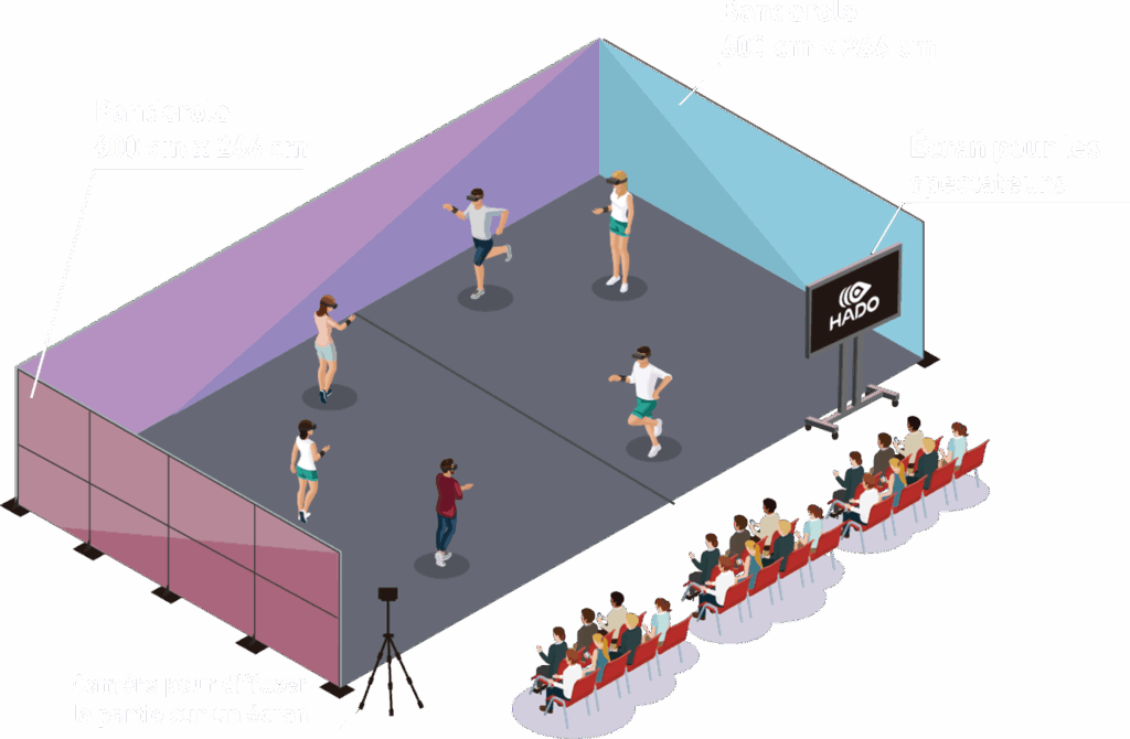 Un terrain officiel HADO PVP nécessite un espace de jeu de 60 m², soit 6 m x 10 m, avec une hauteur de plafond d’au moins 2,66 m. Il peut accueillir jusqu’à 6 joueurs. Ces dimensions peuvent être ajustées. Contactez-nous pour obtenir plus de détails.