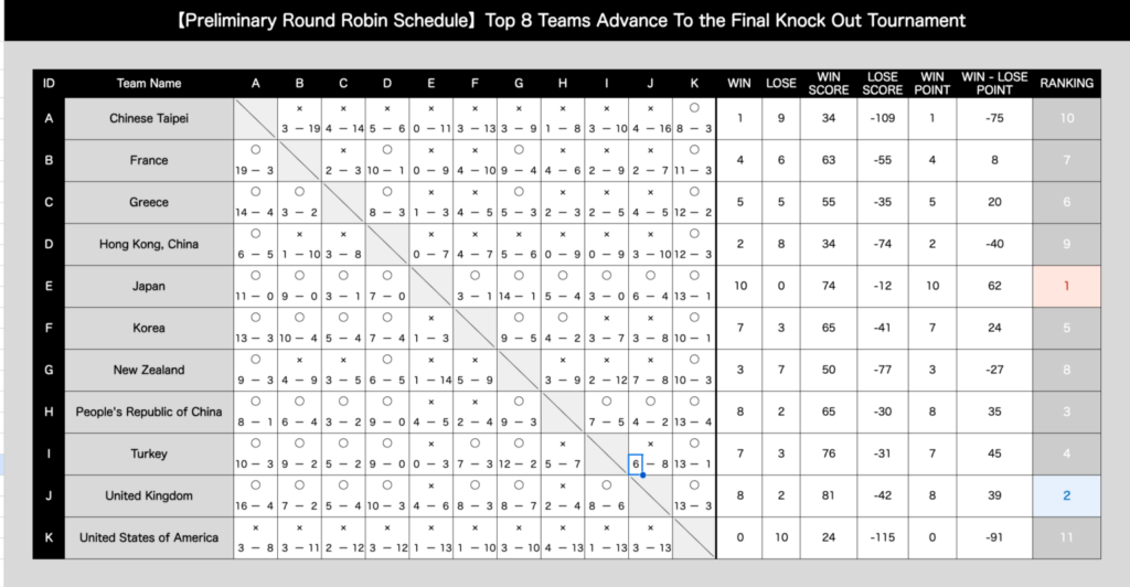 Au début du tournoi à la ronde, le Japon et la Turquie ont constamment mené la danse, mais au fur et à mesure que la compétition progressait, les forces et les classements de chaque nation devenaient de plus en plus évidents. Les cinq meilleures équipes, à savoir la Corée du Sud, le Japon, la Chine, l’Angleterre et la Turquie, se sont disputé les honneurs, attirant l’attention sur leurs rencontres, car toute défaite aurait un impact direct sur leur classement, créant une atmosphère compétitive et tendue à la fois sur et en dehors du terrain.